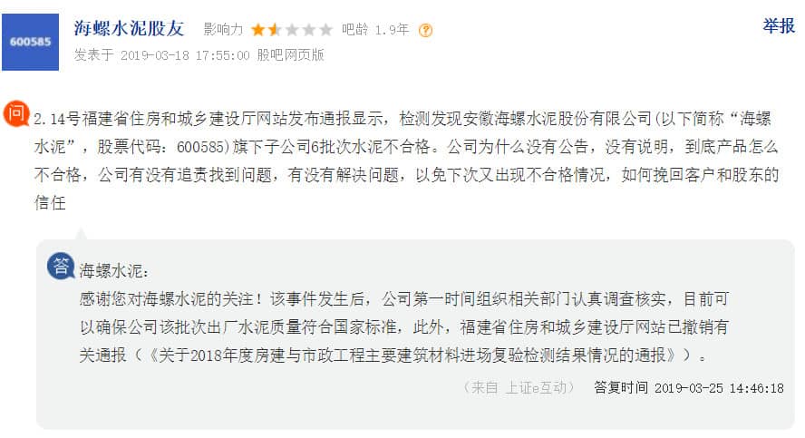 日前,有投資者向海螺水泥(600585)提問,2.14號福建省住房和城鄉(xiāng)建設(shè)廳網(wǎng)站發(fā)布通報顯示,檢測發(fā)現(xiàn)安徽海螺水泥股份有限公司(以下簡稱“海螺水泥”,股票代碼:600585)旗下子公司6批次水泥不合格。公司為什么沒有公告,沒有說明,到底產(chǎn)品怎么不合格,公司有沒有追責(zé)找到問題,有沒有解決問題,以免下次又出現(xiàn)不合格情況,如何挽回客戶和股東的信任。