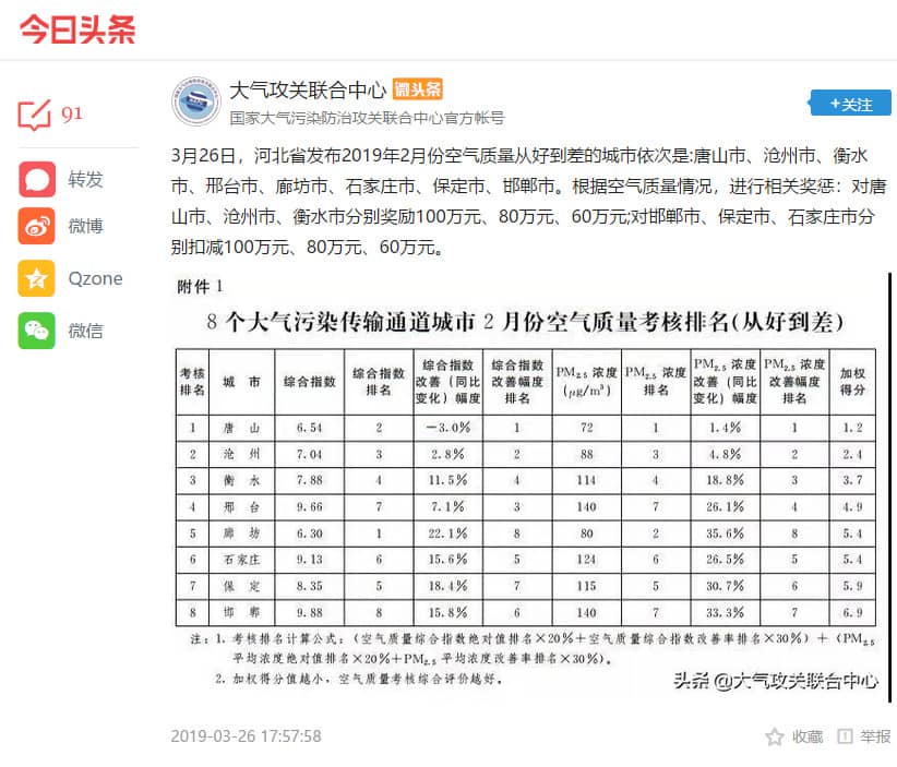 日前,國家大氣污染防治攻關(guān)聯(lián)合中心公布:3月26日,河北省發(fā)布2019年2月份空氣質(zhì)量從好到差的城市依次是:唐山市、滄州市、衡水市、邢臺市、廊坊市、石家莊市、保定市、邯鄲市。根據(jù)空氣質(zhì)量情況,進行相關(guān)獎懲:對唐山市、滄州市、衡水市分別獎勵100萬元、80萬元、60萬元;對邯鄲市、保定市、石家莊市分別扣減100萬元、80萬元、60萬元。