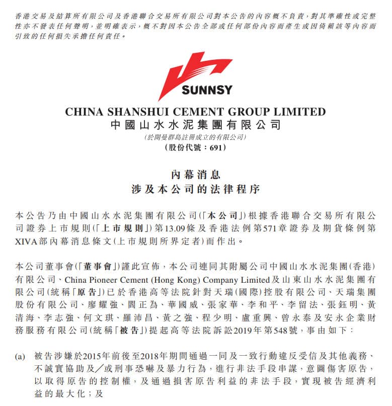 山水水泥(00691)公布,該公司連同其附屬公司中國(guó)山水水泥集團(tuán)(香港)有限公司、China Pioneer Cement(Hong Kong)Company Limited及山東山水水泥集團(tuán)有限公司(統(tǒng)稱原告)已于香港高等法院針對(duì)天瑞(國(guó)際)控股有限公司、天瑞集團(tuán)股份有限公司、廖耀強(qiáng)、閻正為、華國(guó)威、張家華、李和平、李留法、張鈺明、黃清海、李志強(qiáng)、何文琪、羅沛昌、黃之強(qiáng)、程少明、盧重興、曾永泰及安永企業(yè)財(cái)務(wù)服務(wù)有限公司(統(tǒng)稱被告)提起高等法院訴訟2019年第548號(hào)。