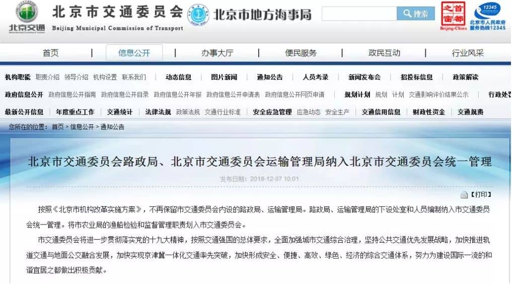 北京市交通委員會去年12月7日便下發(fā)了《北京市機構改革實施方案》,不再保留北京市交通委員會內設的路政局、運輸管理局。