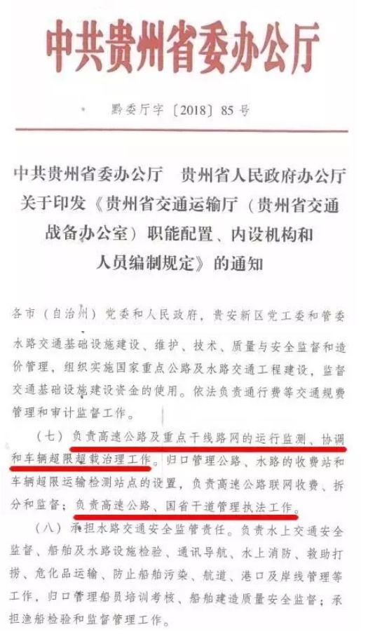貴州省印發(fā)交通運輸廳三定方案,指出負責高速公路及重點干線路網的運行監(jiān)測、協(xié)調和車輛超限超載治理工作。歸口管理公路、水路的收費站和車輛超限運輸檢測站點的設置,負責高速公路聯網收費、拆分和監(jiān)督;負責高速公路、國省干道管理執(zhí)法工作。由此可以理解為:貴州的高速公路、國省道管理執(zhí)法工作,由省垂直管理?