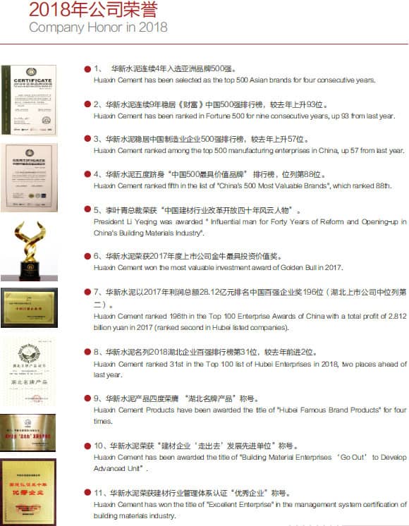 2018年11月15日,第20屆中國(guó)上市公司金牛獎(jiǎng)?lì)C獎(jiǎng)典禮在四川成都舉行,華新水泥榮獲“2017年度金牛最具投資價(jià)值獎(jiǎng)”,華新水泥董事會(huì)秘書(shū)王錫明榮獲“2017年度金牛董秘獎(jiǎng)”,為100位最佳金牛董秘之一。