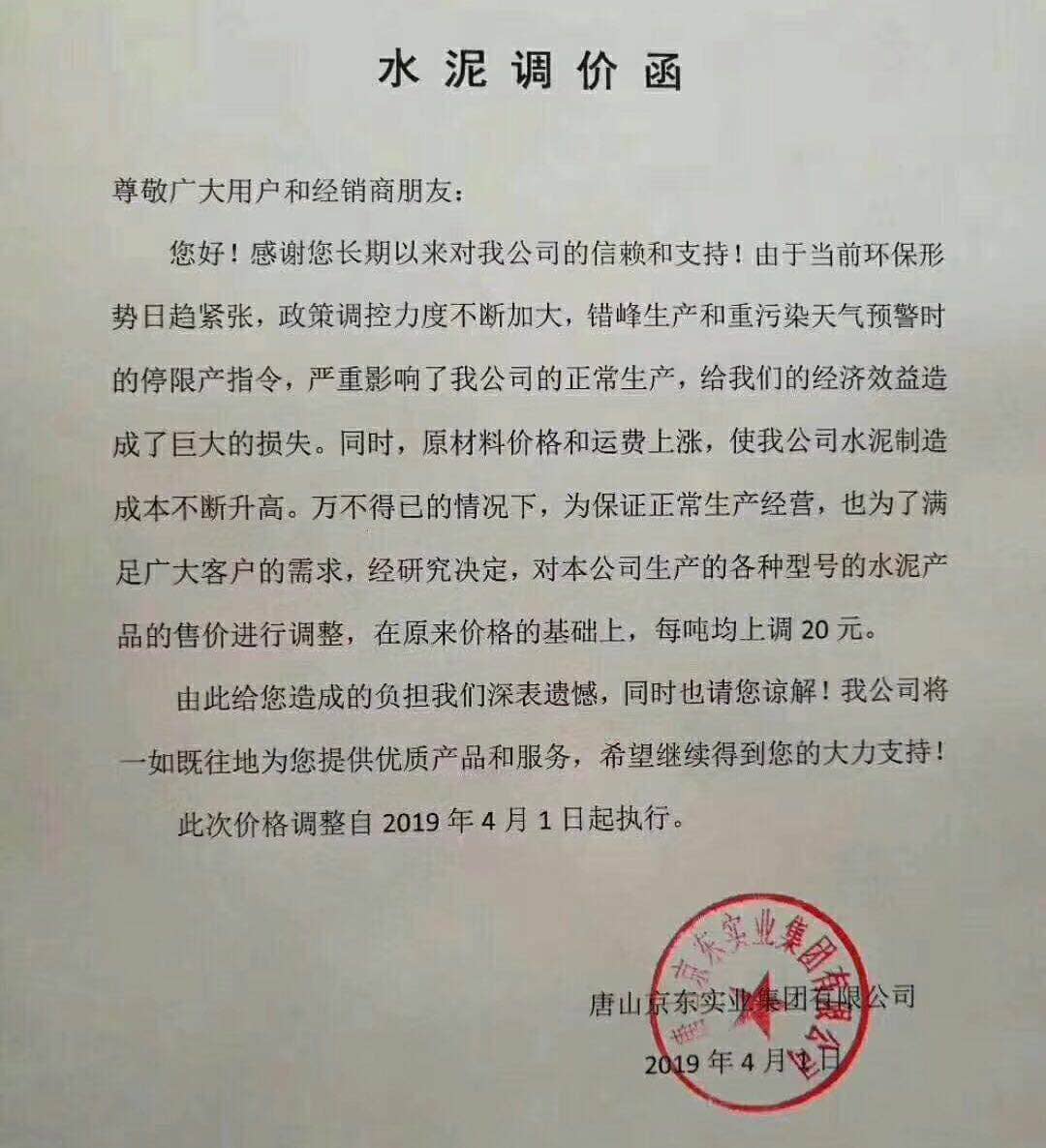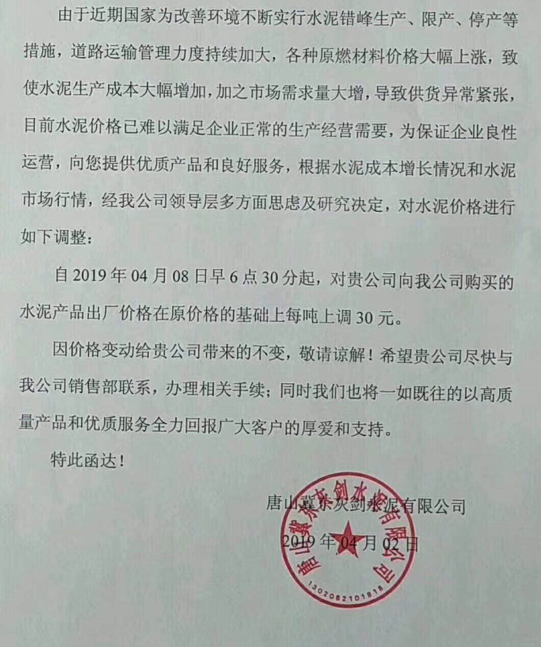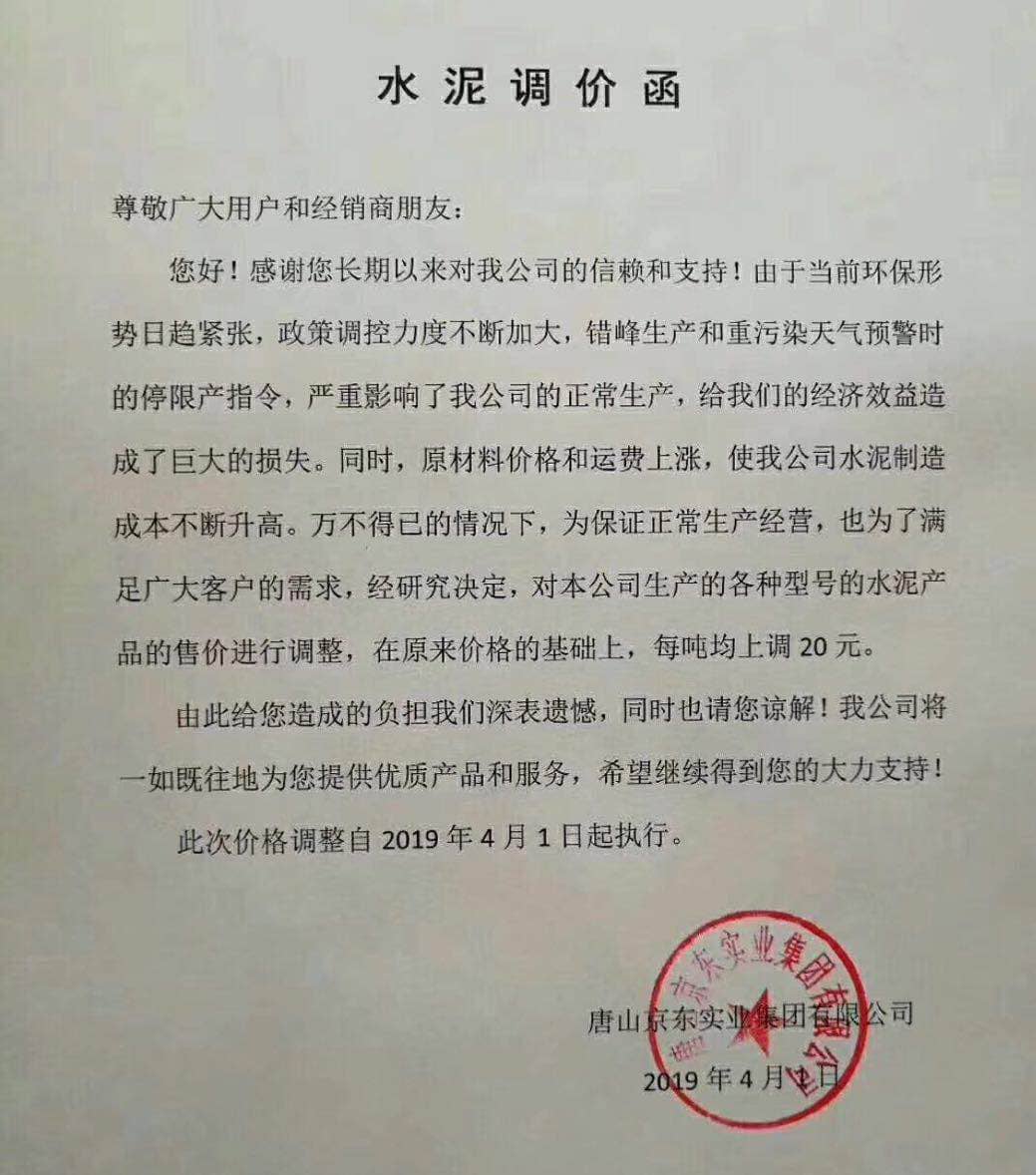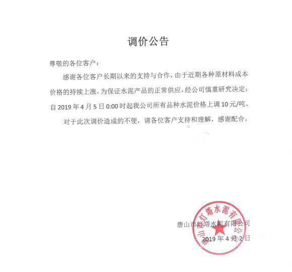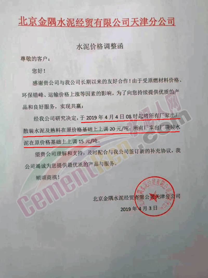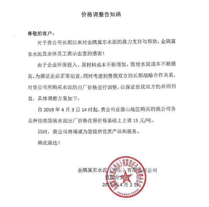 北京金隅水泥經(jīng)貿(mào)有限公司天津分公司水泥價(jià)格調(diào)整函稱,由于受原燃材料價(jià)格、環(huán)保錯(cuò)峰、運(yùn)輸價(jià)格上漲等因素的影響。經(jīng)公司研究決定,于4月4日8時(shí)起將所有廠家出廠散裝水泥及熟料在原價(jià)格基礎(chǔ)上上調(diào)20元/噸。所有廠家出廠袋裝水泥在原價(jià)格基礎(chǔ)上上調(diào)15元/噸。
