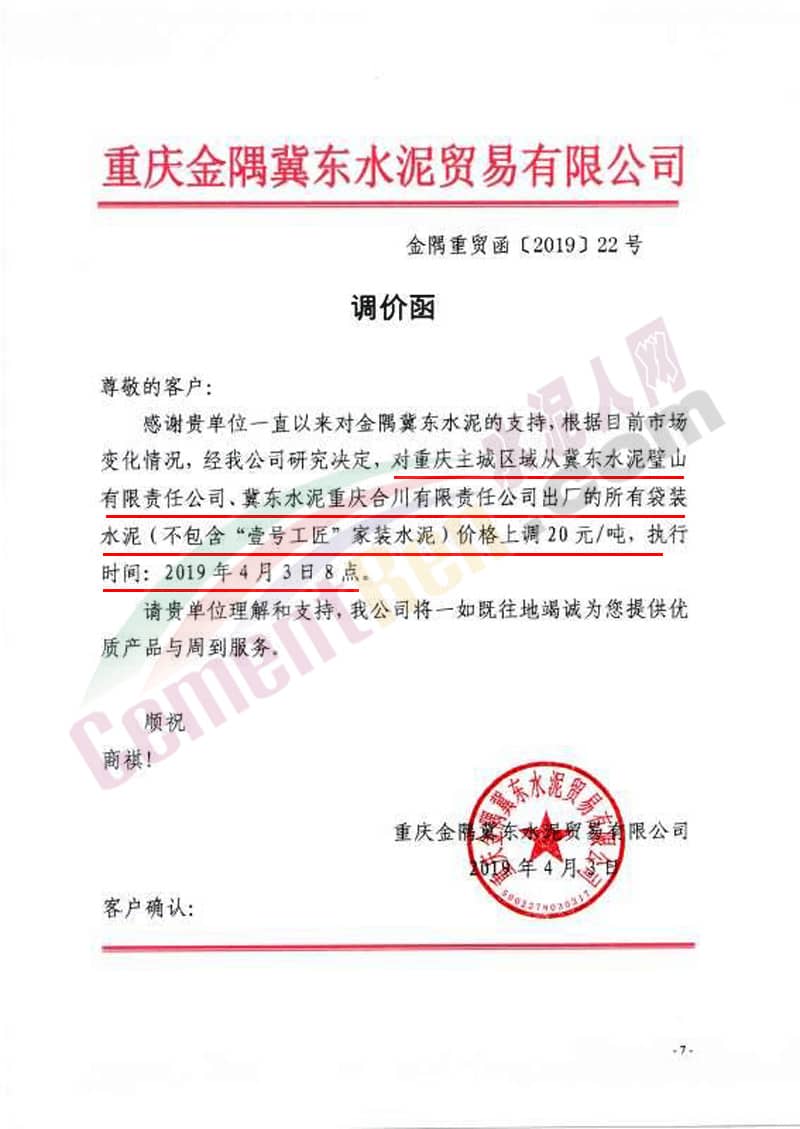同期,重慶區(qū)域主導(dǎo)企業(yè)亦通知上調(diào)水泥價(jià)格,重慶金隅冀東水泥貿(mào)易有限公司調(diào)價(jià)函稱,根據(jù)目前市場(chǎng)變化情況 ,經(jīng)公司研究決定 ,對(duì)重慶主城區(qū)從冀東水泥璧山有限公司、冀東水泥重慶合川有限責(zé)任公司出廠的所有袋裝水泥(不包含“壹號(hào)工匠”家裝水泥)價(jià)格上調(diào)20元/噸,執(zhí)行時(shí)間4月3日8點(diǎn)。