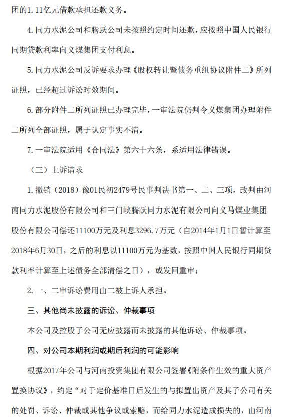 2018年7月,義煤集團(tuán)訴河南同力水泥股份有限公司和三門峽騰躍同力水泥有限公司合同糾紛一案由河南省鄭州市中級人民法院立案受理。鄭州中級人民法院判決河南同力水泥股份有限公司在三方配合完成本判決第一項(xiàng)所列證照辦理完畢后30日內(nèi),向三門峽騰躍同力水泥有限公司提供1.11億元資金,由三門峽騰躍同力水泥有限公司用于償還其對義煤集團(tuán)的債務(wù)。同時鄭州中級人民法院判決案件受理費(fèi)由義馬煤業(yè)集團(tuán)股份有限公司負(fù)擔(dān)和河南同力水泥股份有限公司共同負(fù)擔(dān)。公告原文如下:
