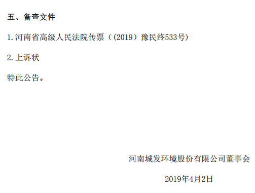 4月3日,河南城發(fā)環(huán)境股份有限公司(000885.SZ)發(fā)布(以下簡稱城發(fā)環(huán)境)《重大訴訟公告》(以下簡稱“公告”)。城發(fā)環(huán)境近日收到河南省高級人民法院送達(dá)的義馬煤業(yè)集團(tuán)股份有限公司(以下簡稱義煤集團(tuán))對鄭州市中級人民法院(2018)豫01民初2479號民事判決的上訴狀和 (2019)豫民終533號案件傳票。