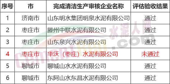 近日,山東省生態(tài)環(huán)境廳公布了2018年清潔生產(chǎn)審核評估驗收情況,所列六家水泥企業(yè)中位于山東棗莊市的華沃(棗莊)水泥有限公司未通過評估驗收,需要重新開展清潔生產(chǎn)審核。