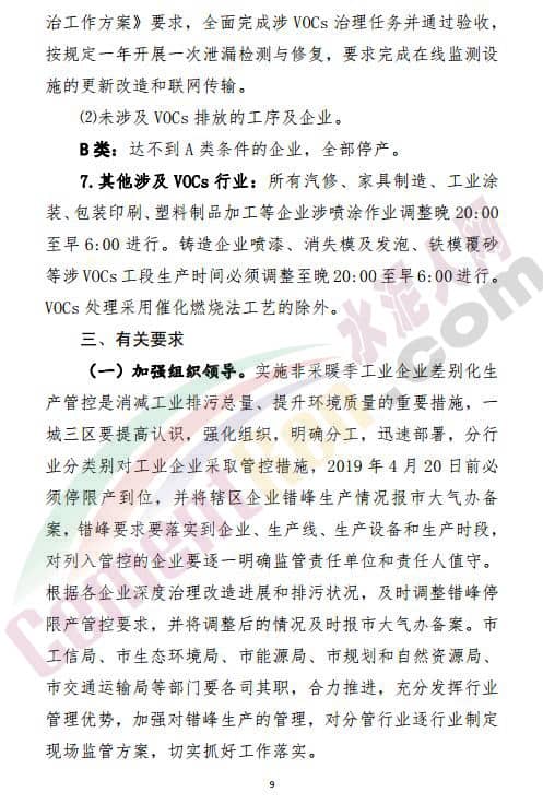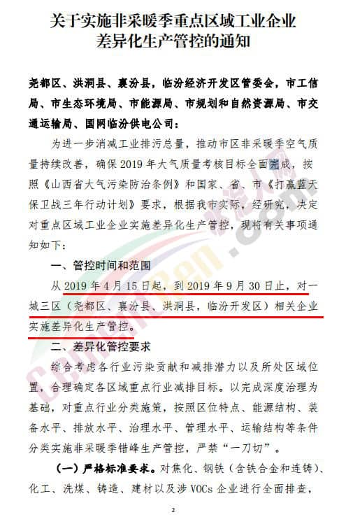 日前,山西臨汾市下達(dá)非采暖季重點(diǎn)區(qū)域差異化生產(chǎn)管控的通知,從2019年4月15日起,到2019年9月30日止,對(duì)一城三區(qū)(堯都區(qū)、襄汾縣、洪洞縣,臨汾開(kāi)發(fā)區(qū))相關(guān)企業(yè)實(shí)施差異化生產(chǎn)管控。嚴(yán)格對(duì)照臨發(fā)[2017]3號(hào)文件, 臨發(fā)[2018]2號(hào)文件,焦化、鋼鐵、洗煤、鑄造、磚瓦、混凝土攪拌等行業(yè)環(huán)保整治方案和《臨汾市2018年重點(diǎn)行業(yè)揮發(fā)性有機(jī)物(VOCs)污染防治工作方案》。重點(diǎn)對(duì)鋼鐵(含連鑄和鐵合金)、焦化、水泥(不含粉磨站)、鑄造其他涉VOCs行業(yè)分類實(shí)施差別化管控。