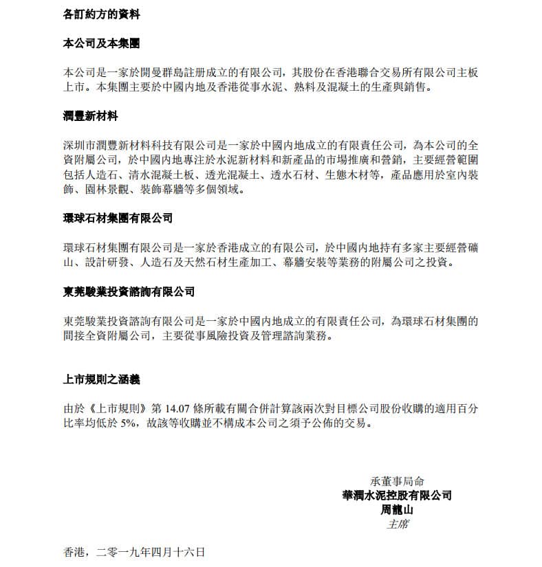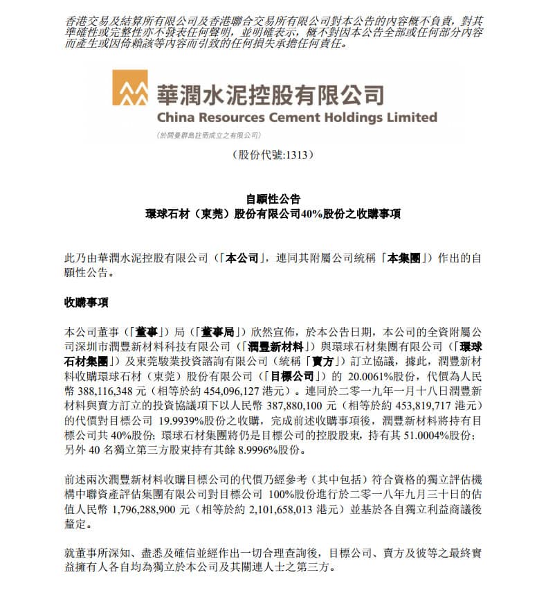 華潤(rùn)水泥控股公告,該公司的全資附屬公司深圳市潤(rùn)豐新材料科技有限公司與環(huán)球石材集團(tuán)有限公司及東莞駿業(yè)投資諮詢(xún)有限公司訂立協(xié)議,據(jù)此,潤(rùn)豐新材料收購(gòu)環(huán)球石材(東莞)股份有限公司(目標(biāo)公司)的20.0061%股份,代價(jià)為人民幣3.88億元。
