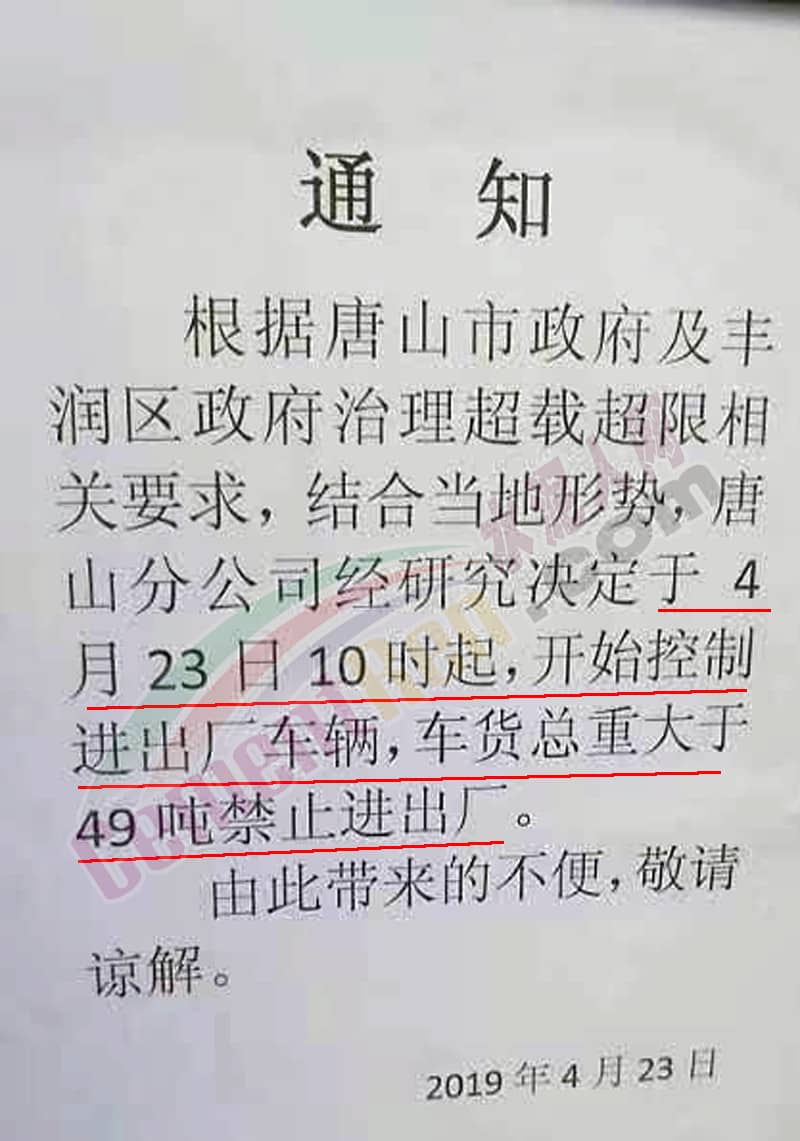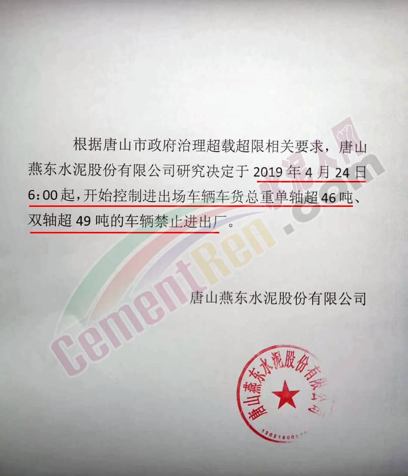 冀東水泥發(fā)通知稱:根據(jù)唐山市政府及豐潤(rùn)區(qū)政府治理超限相關(guān)要求,結(jié)合當(dāng)?shù)匦蝿?shì),唐山分公司研究決定于4月23日10時(shí)起,開(kāi)始控制進(jìn)出廠車輛,車貨總重大于49噸禁止進(jìn)出廠。