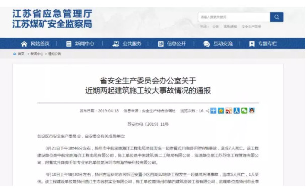 上周四(4月18日),江蘇省應急管理廳發(fā)布了近期兩起建筑施工較大事故通報。