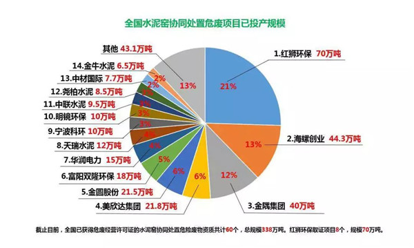以上為我國(guó)水泥窯協(xié)同處置項(xiàng)目分布及處置規(guī)模示意圖,因數(shù)據(jù)獲取渠道有限,個(gè)別企業(yè)數(shù)據(jù)會(huì)有出入,部分知名企業(yè)集團(tuán)項(xiàng)目數(shù)據(jù)不詳,暫列入其他,僅供讀者參考。
