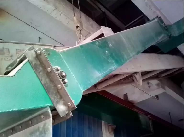 兩半集塵罩上各有一個出風口分別連接抽風主管(兩套),抽風主管一端與集塵罩相連接。另一端與水平伸縮主管(兩套)相連接,連接處為一可旋轉活動接頭。保證在裝車過程中集塵罩升降自如。在移動式裝車皮帶機兩側樓板下面安裝兩套工字鋼軌道和兩套可伸縮的水平抽風主管;每根伸縮節(jié)之間的密封采用橡膠板密封,其內安裝滑輪,管外安裝滑輪(以行車電動葫蘆的形式)并放在軌道上,使其隨皮帶機的水平移動而伸縮。