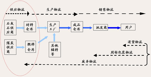 水泥行業(yè)的物流按業(yè)務(wù)環(huán)節(jié)產(chǎn)生先后順序分為供應(yīng)物流、生產(chǎn)物流和銷售物流三部分,如圖1,其中供應(yīng)物流和銷售物流對(duì)水泥企業(yè)的影響最大。
