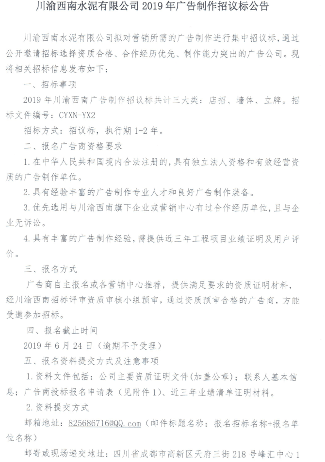 川渝西南水泥有限公司擬對(duì)營(yíng)銷(xiāo)所需的廣告制作進(jìn)行集中招議標(biāo),通過(guò)公開(kāi)邀請(qǐng)招標(biāo)選擇資質(zhì)合格、合作經(jīng)歷優(yōu)先、制作能力突出的廣告公司?,F(xiàn)將相關(guān)招標(biāo)信息發(fā)布如下: