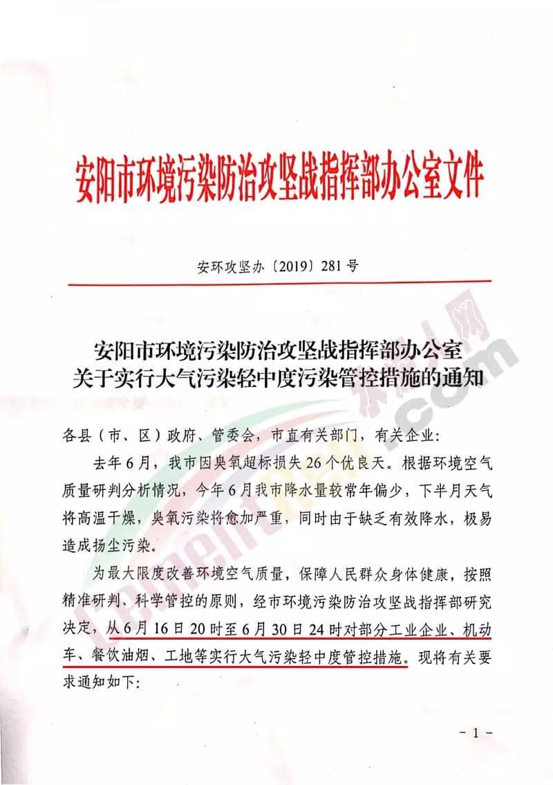 水泥人網(wǎng)通訊員消息:日前,河南省安陽市環(huán)境污染防治攻堅戰(zhàn)指揮部發(fā)布安環(huán)攻堅辦【2019】281號文件《關(guān)于實行大氣污染輕中度污染管控措施的通知》稱去年6月,安陽市因臭氧超標損失26個優(yōu)良天。根據(jù)環(huán)境空氣質(zhì)量研判分析情況 ,今年6月安陽市降水量較常年偏少,下半月天氣將高溫干燥,臭氧污染將愈加嚴重,同時由于缺乏有效降水,極易造成揚塵污染。為最大限度改善環(huán)境空氣質(zhì)量,保障人民群眾身體健康,按照精準研判、科學管控的原則,經(jīng)安陽市環(huán)境污染防治攻堅戰(zhàn)指揮部研究決定,從6月16日20時至6月30日24時對部分工業(yè)企業(yè)、機動車、餐飲油煙、工地等實行大氣污染輕中度管控措施。