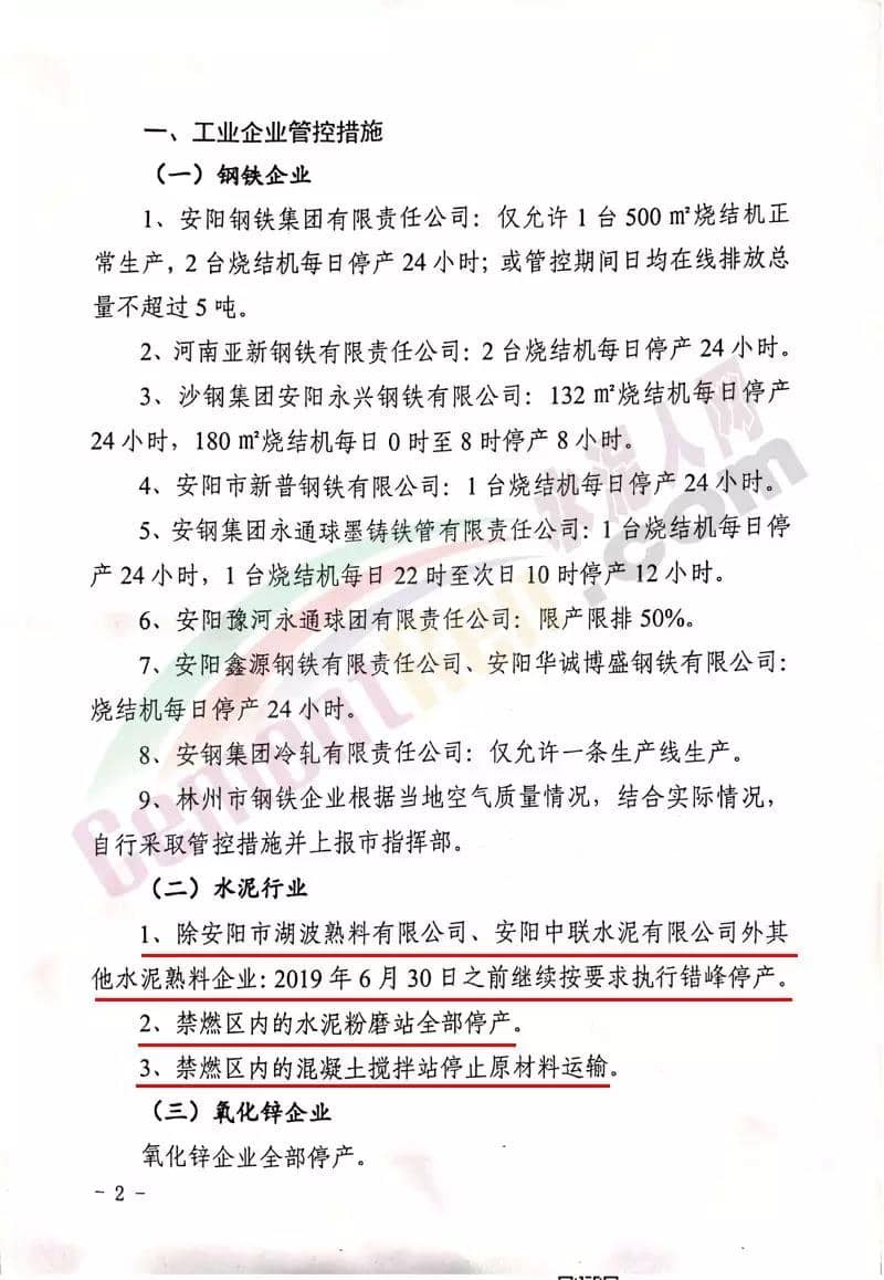 水泥行業(yè)除安陽市湖波熟料有限公司、安陽中聯(lián)水泥有限公司外其他水泥熟料企業(yè):2019年6月30日之前繼續(xù)按要求執(zhí)行錯峰停產(chǎn);禁燃區(qū)內(nèi)的水泥粉磨站全部停產(chǎn);禁燃區(qū)內(nèi)的混凝土攪拌站停止原材料運輸。針對于督導發(fā)現(xiàn)工業(yè)企業(yè)未按要求落實管理措施的,一律停工整改15天。