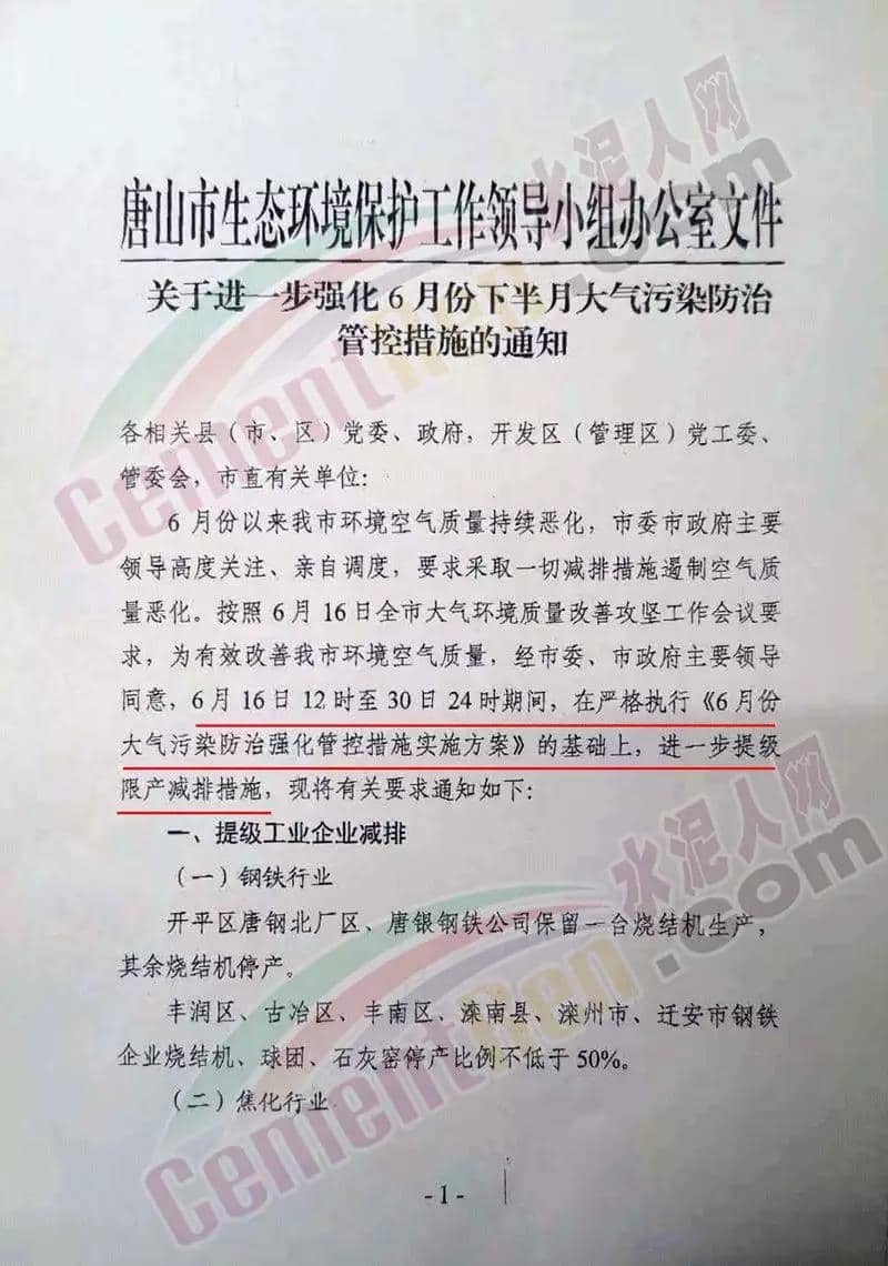 也是在6月16日,河北唐山市生態(tài)環(huán)境保護工作領(lǐng)導小組界定發(fā)布《關(guān)于進一步強化6月份下半月大氣污染防治管控措施的通知》稱:6月份以來唐山市環(huán)境空氣質(zhì)量持續(xù)惡化,市委市政府主要領(lǐng)導高度關(guān)注、親自調(diào)度,要求采取一切減排措施遏制空氣質(zhì)量惡化。按照6月16日全市大氣環(huán)境質(zhì)量改善攻堅工作會議要求,為有效改善全市環(huán)境空氣質(zhì)量,經(jīng)唐山市委、市政府主要領(lǐng)導同意,6月16日12時至30日24時期間,在嚴格執(zhí)行《6月份大氣污染強化管控措施實施方案》的基礎(chǔ)上,進一步提級限產(chǎn)減排措施。