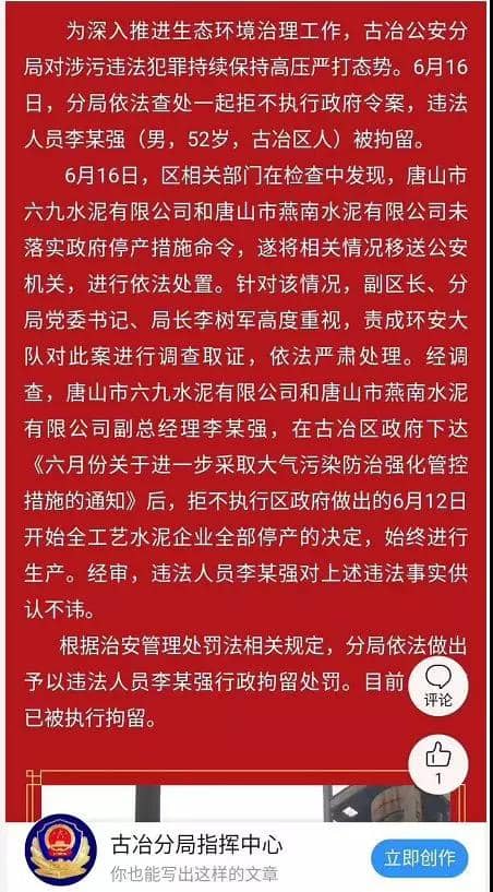 針于古冶區(qū)相關(guān)企業(yè)的管控,唐山市古冶區(qū)公安分局通報了一起拒不執(zhí)行政府令案。通報稱,為深入推進生態(tài)環(huán)境治理工作,古冶公安分局對涉污違法犯罪持續(xù)保持高壓嚴打態(tài)勢。6月16日,分局依法查處一起拒不執(zhí)行政府令案。6月16日,區(qū)相關(guān)部門在檢查中發(fā)現(xiàn),唐山市六九水泥有限公司和唐山市燕南水泥有限公司未落實政府停產(chǎn)措施命令,遂將相關(guān)情況移送公安機關(guān),進行依法處置。針對該情況,副區(qū)長、分局黨委書記、局長李樹軍高度重視,責成環(huán)安大隊對此案進行調(diào)查取證,依法嚴肅處理。經(jīng)調(diào)查,唐山市六九水泥有限公司和唐山市燕南水泥有限公司副總經(jīng)理李某強,在古冶區(qū)政府下達《六月份關(guān)于進一步采取大氣污染防治強化管控措施的通知》后,拒不執(zhí)行區(qū)政府做出的6月12日開始全工藝水企業(yè)全部停產(chǎn)的決定,始終進行生產(chǎn)。經(jīng)審,違法人員李某強對上述違法事實供認不諱。根據(jù)治安管理處罰法相關(guān)規(guī)定,分局依法做出予以違法人員李某強行政拘留處罰。通報原文如下: