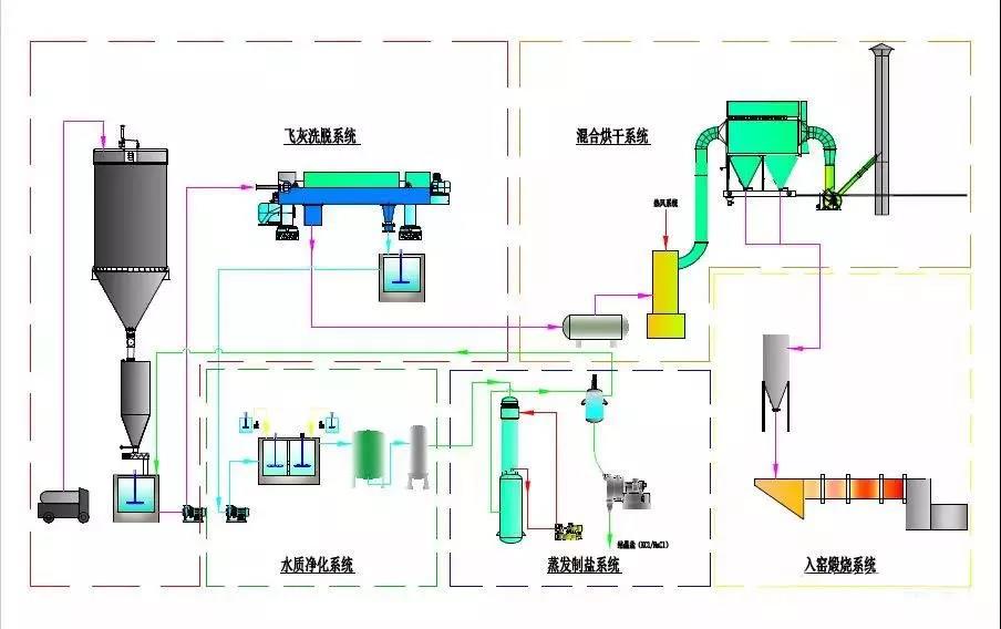 該技術(shù)采用水洗提取飛灰中的鉀鈉硫氯,制成工業(yè)產(chǎn)品;余下部分送入水泥窯高溫煅燒,飛灰中的重金屬經(jīng)高溫熔融后完全固化于水泥熟料晶格中,二噁英在高溫水泥窯中徹底分解,且不具二次合成條件;洗灰廢水循環(huán)利用,零排放;煙氣經(jīng)多級吸附和收塵后達標準排放。完全實現(xiàn)了垃圾焚燒飛灰處置的減量化、資源化和無害化。