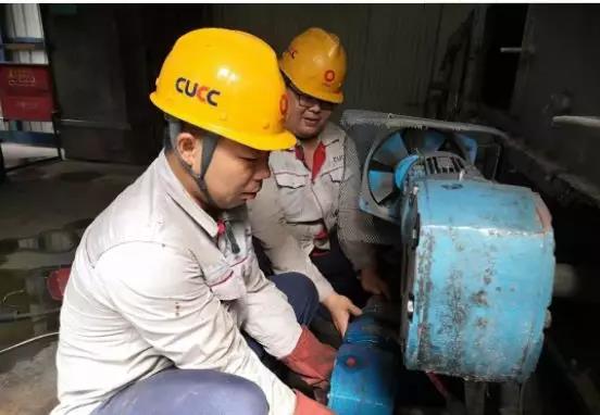 熟料車間維修工劉佳和巡檢工張雪松正在1號窯頭原煤稱對皮帶清掃器減速機(jī)進(jìn)行檢查,兩人相互配合,對原煤稱下料口、皮帶、減速機(jī)、托輥等進(jìn)行全面細(xì)致檢查,確保檢修質(zhì)量。