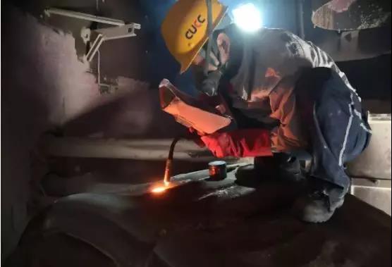 在2號生料立磨,機(jī)電車間維修班長宋新奇正在對磨輥進(jìn)行手工堆焊,為節(jié)省檢修時間,提高效率,他和田強(qiáng)兩人換班作業(yè)。