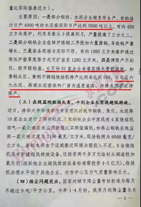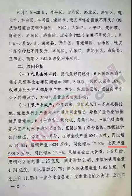 在空氣質(zhì)量不達(dá)標(biāo)的原因闡述中,限產(chǎn)未減產(chǎn)被視為一個重要方面。其中,部分鋼鐵、水泥企業(yè)超負(fù)荷生產(chǎn)。今年1-5月份,唐山市限產(chǎn)卻未減產(chǎn),水泥產(chǎn)量988.8萬噸,同比增加11.9%。主要原因是部分水泥企業(yè)超負(fù)荷生產(chǎn),有的設(shè)計日產(chǎn)4000噸的水泥窯實際日產(chǎn)達(dá)到5500噸以上以及6月份古冶區(qū)六九水泥、燕南水泥窯體和廠房內(nèi)溫度偏高,涉嫌未按要求停限產(chǎn)。