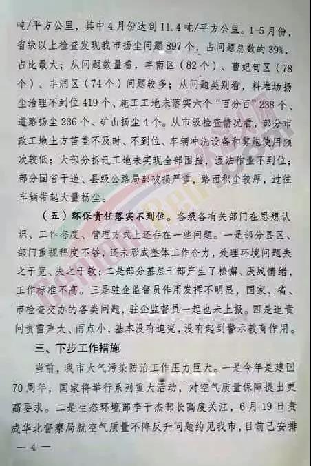 此外,文件指出,唐山市揚(yáng)塵問題突出,1—5月份,省級以上檢查發(fā)現(xiàn)的揚(yáng)塵問題有897個,占問題總數(shù)的39%。當(dāng)前,唐山市大氣污染防治工作壓力巨大。一是今年是建國70周年,國家將舉行系列重大活動,對空氣質(zhì)量保障提出更高要求。二是生態(tài)環(huán)境部高度重視,6月19日安排專門人員注意摸排重點行業(yè)產(chǎn)量、用電量和去產(chǎn)能情況。