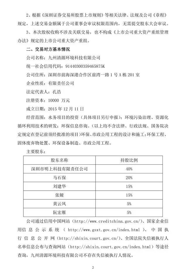 為落實公司產(chǎn)業(yè)升級戰(zhàn)略計劃,推進(jìn)公司在水泥窯協(xié)同處置環(huán)保產(chǎn)業(yè)的發(fā)展,公司控股子公司安徽上峰杰夏環(huán)??萍加邢挢?zé)任公司(以下簡稱“上峰杰夏”)擬以1800萬股收購九州清源環(huán)境科技有限公司(以下簡稱“九州清源”)持有的寧夏萌生環(huán)??萍加邢薰?以下簡稱“萌生環(huán)保”)40%股權(quán),收購?fù)瓿珊?,萌生環(huán)保將成為上峰杰夏的參股子公司。