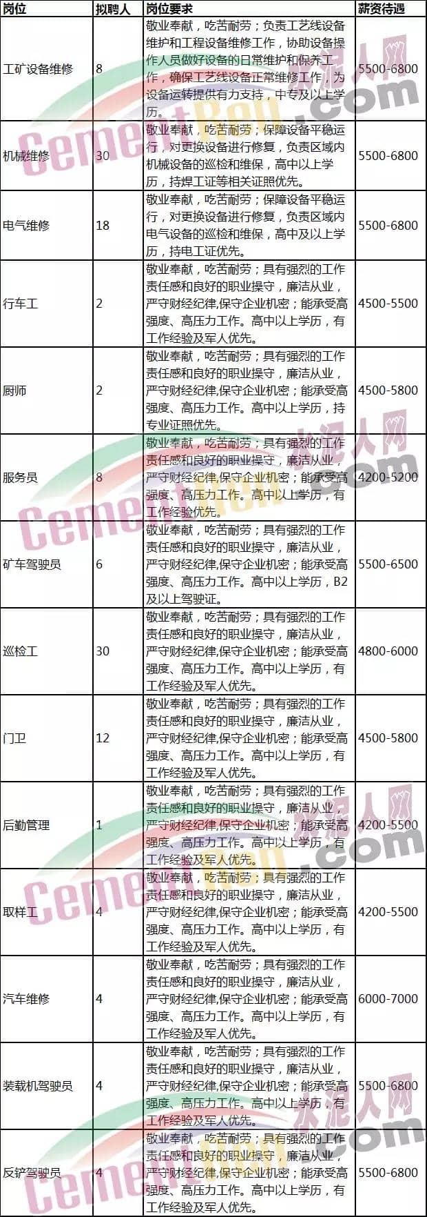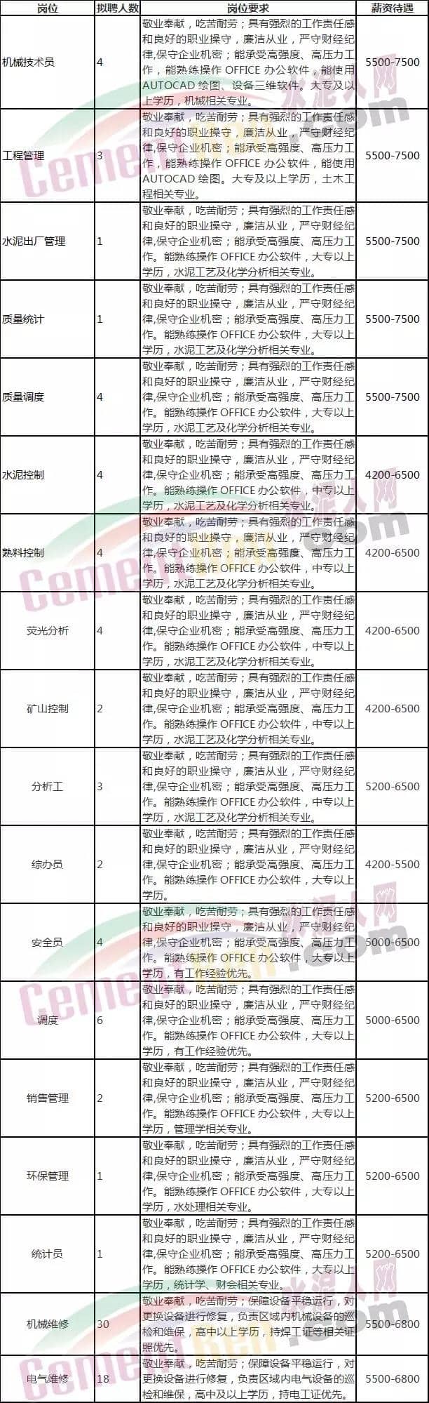 5、安全消防員2名。要求:男女不限,23-40周歲,全日制大專及以上學(xué)歷,采礦工程、安全生產(chǎn)等相關(guān)專業(yè),吃苦耐勞,正直及嚴(yán)謹(jǐn)?shù)墓ぷ髯黠L(fēng),有水泥廠安全生產(chǎn)管理或礦山安全管理工作經(jīng)驗(yàn)者優(yōu)先考慮,試用期工資3000元,試用期2-3個(gè)月;