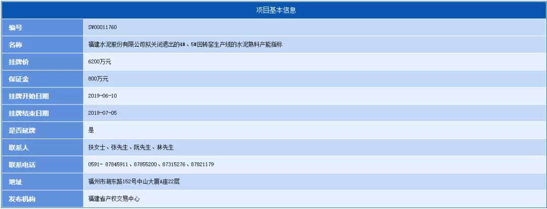受企業(yè)委托,福建省產(chǎn)權(quán)交易中心掛牌出讓福建水泥股份有限公司擬關(guān)閉退出的4#、5#回轉(zhuǎn)窯生產(chǎn)線的水泥熟料產(chǎn)能指標(biāo),現(xiàn)公告如下: