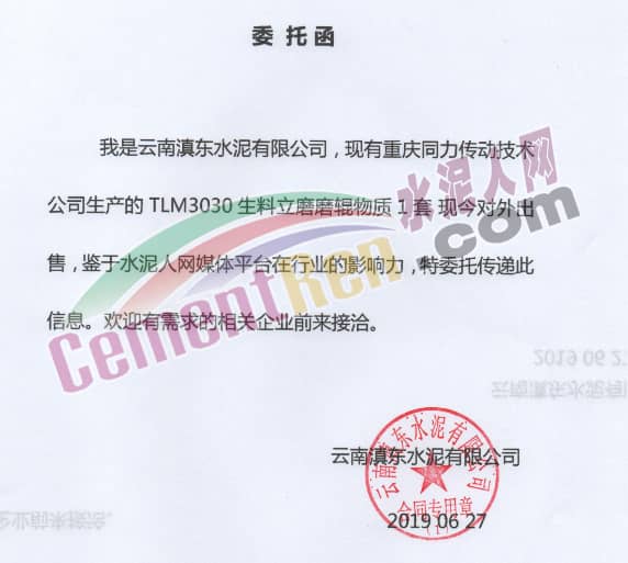 近日,云南滇東水泥有限公司委托水泥人網(wǎng),將現(xiàn)有重慶同力傳動(dòng)技術(shù)公司生產(chǎn)的TLM3030生料立磨輥物1套公對(duì)對(duì)外出售。