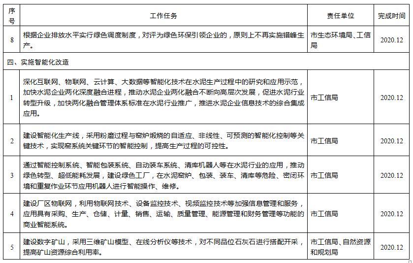 二、工作目標全市圍繞促進產(chǎn)業(yè)轉(zhuǎn)型升級,加快產(chǎn)業(yè)結(jié)構(gòu)調(diào)整,持續(xù)推進水泥行業(yè)健康發(fā)展,到2020年,全市水泥行業(yè)實現(xiàn)水泥產(chǎn)能、水泥熟料企業(yè)、水泥粉磨裝備逐步減少,水泥行業(yè)污染物排放總量大幅減少,企業(yè)熟料生產(chǎn)工序?qū)崿F(xiàn)超低排放;淘汰2000噸/日及以下通用水泥熟料生產(chǎn)線,直徑3米及以下水泥粉磨裝備;企業(yè)智能化水平明顯提升,資源綜合利用水平明顯提升,全員勞動生產(chǎn)率提高30%。