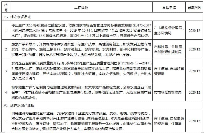 (四)提升水泥品質(zhì)。停止生產(chǎn)32.5等級復合硅酸鹽水泥,依據(jù)國家市場監(jiān)督管理總局標準委發(fā)布的GB175-2007《通用硅酸鹽水泥〈第3號修改單〉》,2019年10月1日前全市“全面取消32.5復合硅酸鹽水泥”,逐步取消32.5等級水泥標準,重點生產(chǎn)42.5及以上等級產(chǎn)品,開展綠色產(chǎn)品認證。加強產(chǎn)學研聯(lián)合,開發(fā)利用特種水泥新型干法生產(chǎn)技術(shù)、高性能混凝土,加快發(fā)展工程專用水泥、砂石骨料、混凝土摻合料、預拌混凝土、預拌砂漿、水泥制品、部件化制品等產(chǎn)品,提高產(chǎn)品附加值,通過技術(shù)提升和產(chǎn)業(yè)轉(zhuǎn)型,搶得市場先機,實現(xiàn)差異化發(fā)展。水泥企業(yè)全部要開展質(zhì)量提升行動,參照《水泥生產(chǎn)企業(yè)質(zhì)量管理規(guī)程》(T/CBMF17—2017)開展對標工作,做好水泥標準化化驗室建設(shè)等質(zhì)量技術(shù)基礎(chǔ)工作,推進企業(yè)內(nèi)部管理制度和質(zhì)量保障能力建設(shè),嚴格實施過程管控,強化社會監(jiān)督,實施守信激勵、失信懲戒,推動水泥產(chǎn)品質(zhì)量提升。將水泥生產(chǎn)許可證制度與追溯管理制度相結(jié)合,加大水泥產(chǎn)品抽檢力度,公布水泥企業(yè)“黑名單”,對產(chǎn)品質(zhì)量不合格的生產(chǎn)企業(yè)依法進行處理,堅決取締無證生產(chǎn)、無質(zhì)量追溯產(chǎn)品標識的水泥企業(yè)。