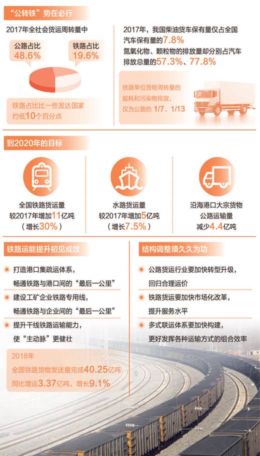 去年9月,國(guó)務(wù)院辦公廳正式印發(fā)《推進(jìn)運(yùn)輸結(jié)構(gòu)調(diào)整三年行動(dòng)計(jì)劃(2018—2020年)》(簡(jiǎn)稱“行動(dòng)計(jì)劃”),提出了明確的任務(wù)與目標(biāo)——任務(wù)涵蓋鐵路運(yùn)能提升、公路貨運(yùn)治理、多式聯(lián)運(yùn)提速等“六大行動(dòng)”;目標(biāo)則是以大宗貨物運(yùn)輸“公轉(zhuǎn)鐵、公轉(zhuǎn)水”為主攻方向,通過三年集中攻堅(jiān),實(shí)現(xiàn)全國(guó)鐵路貨運(yùn)量較2017年增加11億噸(增長(zhǎng)30%)、水路貨運(yùn)量較2017年增加5億噸(增長(zhǎng)7.5%)、沿海港口大宗貨物公路運(yùn)輸量減少4.4億噸。為此,交通運(yùn)輸部會(huì)同鐵路、民航等部門成立了運(yùn)輸結(jié)構(gòu)調(diào)整工作組,合力推動(dòng)此項(xiàng)工作。