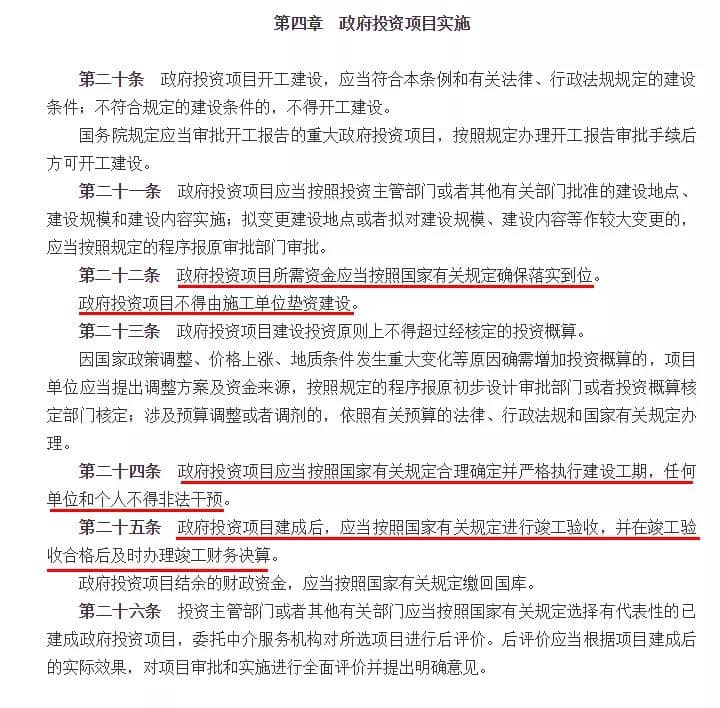 1、禁止“墊資施工”:政府投資項目不得由施工單位墊資建設。