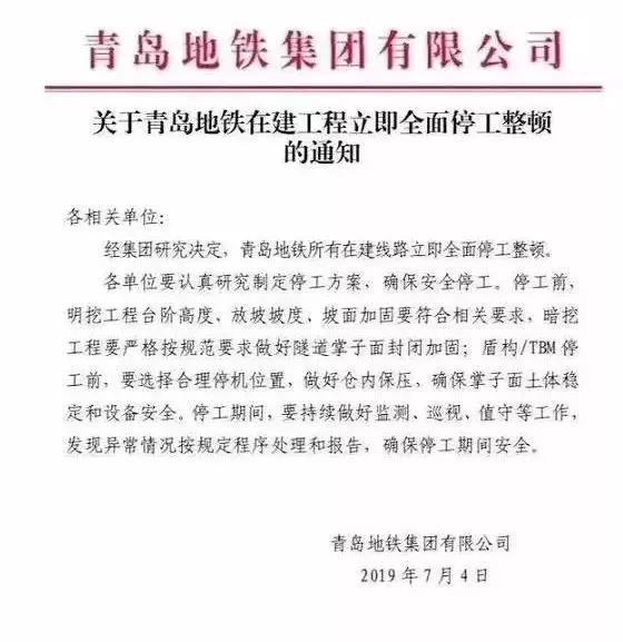 另?yè)?jù)相關(guān)方面最新消息,青島地鐵當(dāng)日已經(jīng)下發(fā)通知立即全面停工整頓,涉所有在建線(xiàn)路,要求各單位研究制定停工方案,確保安全停工。