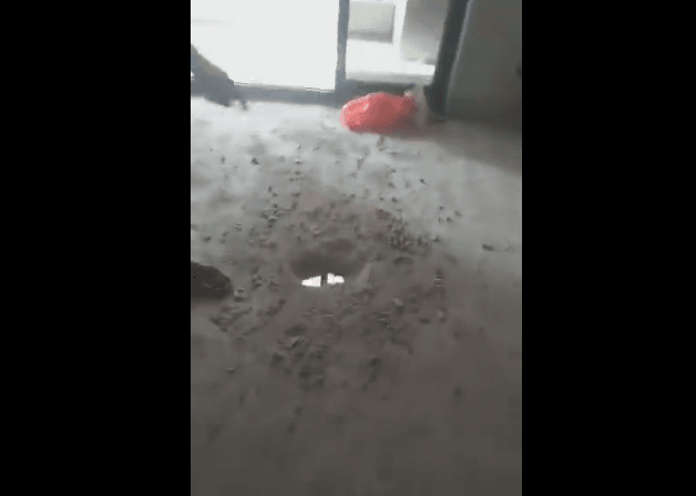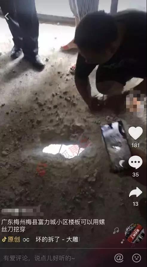 從視頻中可見,該事件發(fā)生在梅州富力城第4期22棟803號房,業(yè)主僅用一把螺絲刀便可以輕松刮開地板上的水泥,捅出一個窟窿,水泥毫無強度、韌性、穩(wěn)定性可言,鋼筋也是相當細,根本無法想象這可以保證樓上、樓下兩家人的日常生活安全。