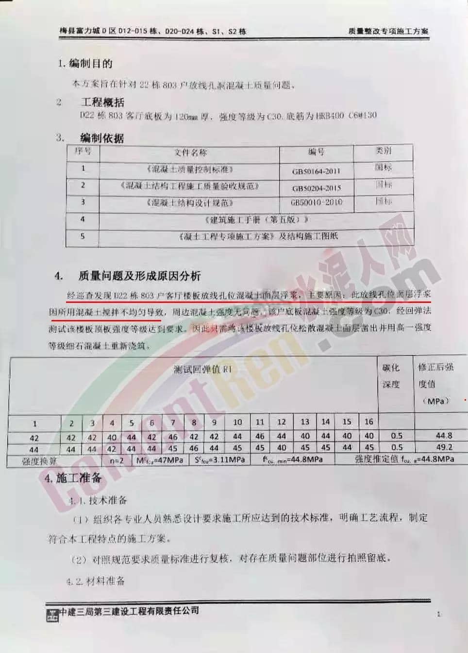 該質(zhì)量整改項施工方案中指出:經(jīng)巡查發(fā)現(xiàn)D22棟803戶客廳樓板放線孔位混凝土面層浮槳因所用混凝土攪拌不均勻?qū)е?,周邊混凝土強度無問題,一句輕描淡寫的話就給此事劃上了句號。