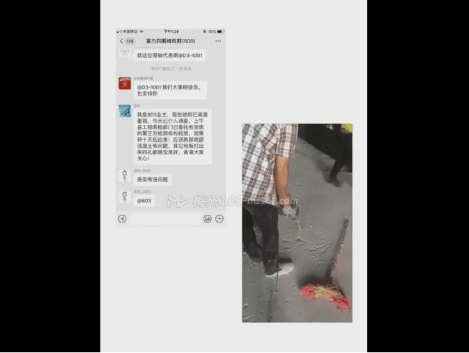 據(jù)梅州富力城4期初業(yè)主表示:昨晚該視頻在微信群傳開了,出于對自身房屋的擔憂,還特意去檢測了下自己的房子,幸好沒發(fā)現(xiàn)問題。“可能是不同時期建造的房子,混凝土質(zhì)量不一樣。” 該業(yè)主表示。