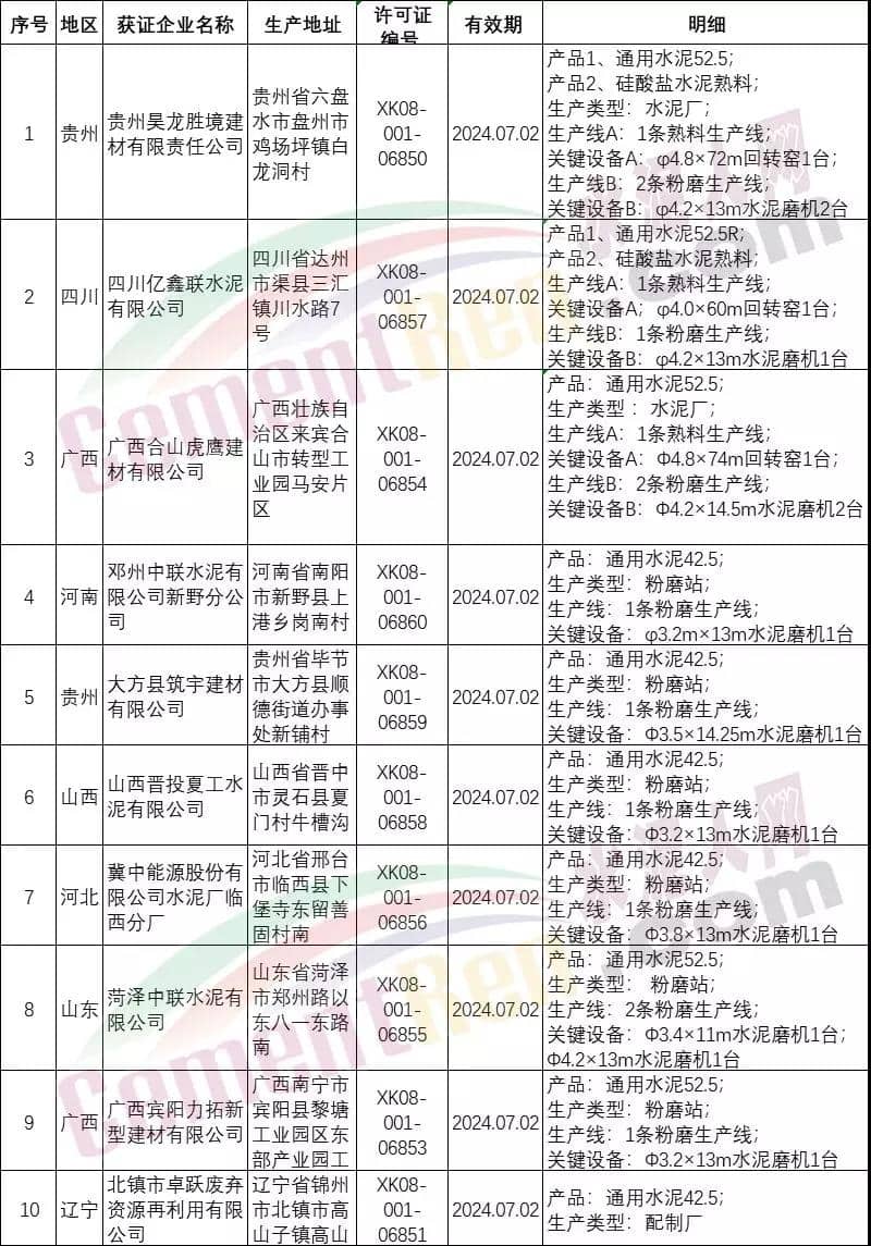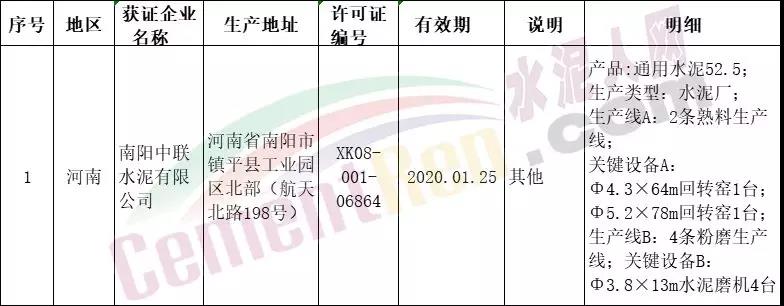 本期發(fā)放生產許可證的南陽中聯(lián)水泥有限公司生產地址位于河南省南陽市鎮(zhèn)平縣工業(yè)園區(qū)北部(航天北路198號)發(fā)證說明為“其他”。據(jù)水泥人網了解,南陽中聯(lián)水泥有限公司2018年12月29日舉行了揭牌儀式,中國聯(lián)合水泥集團有限公司南陽分公司正式變更為具有獨立法人資格的南陽中聯(lián)水泥有限公司。國家市場監(jiān)管總局七月第一批生產許可證發(fā)放詳情如下: