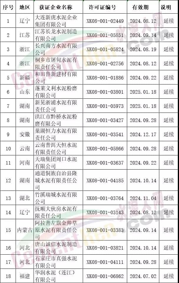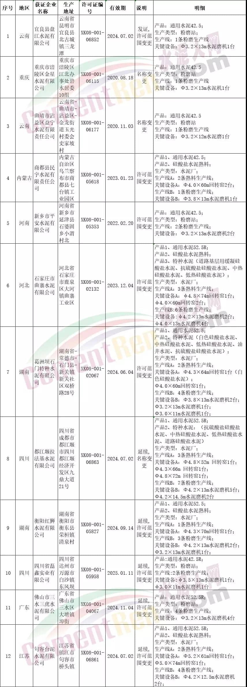 七月第一批發(fā)放證書涉及許可范圍、項目名稱變更的共12個編號,其中包括石家莊市曲寨水泥有限公司、葛洲壩石門特種水泥有限公司、都江堰拉法基水泥有限公司等多家生產特種水泥及通用52.5水泥產品的全能水泥廠;涉及生產許可證到期延續(xù)的企業(yè)共計18個編號。