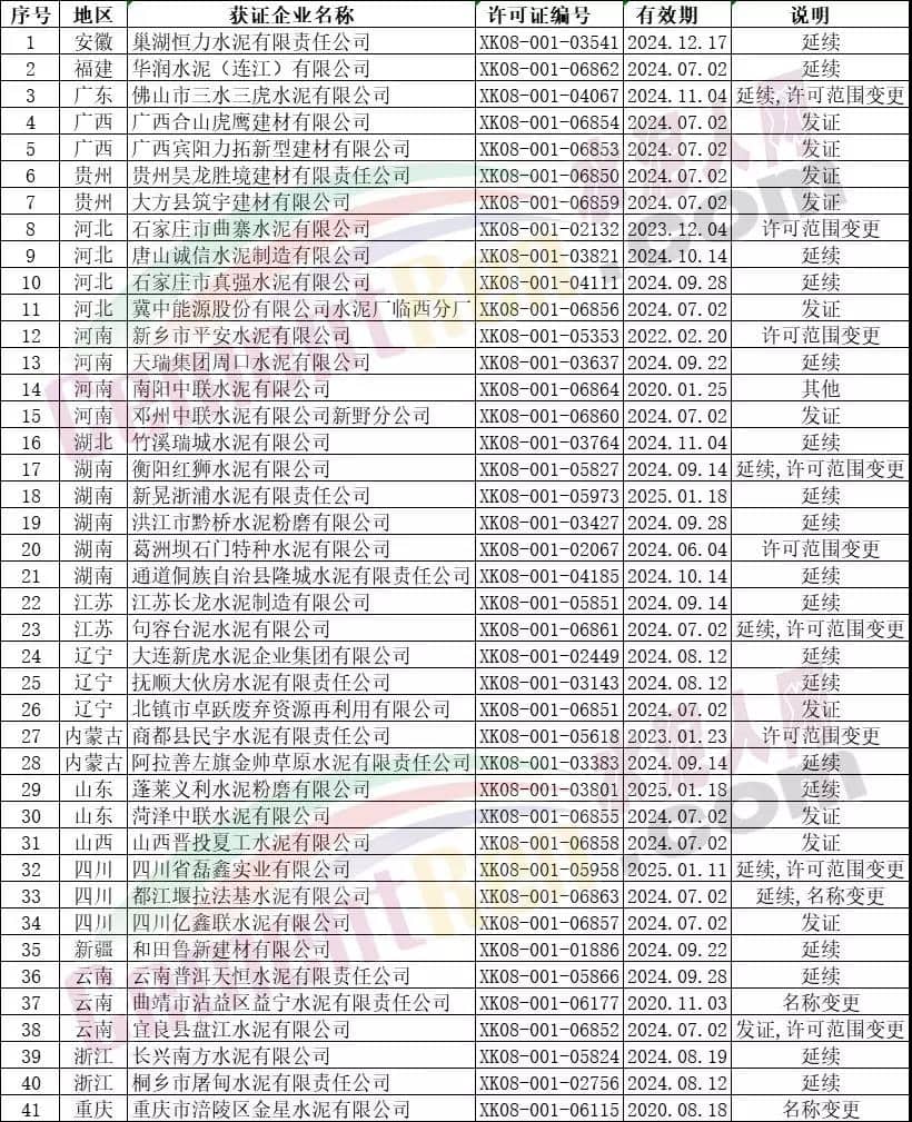 2019年7月第一批水泥企業(yè)生產許可證名單