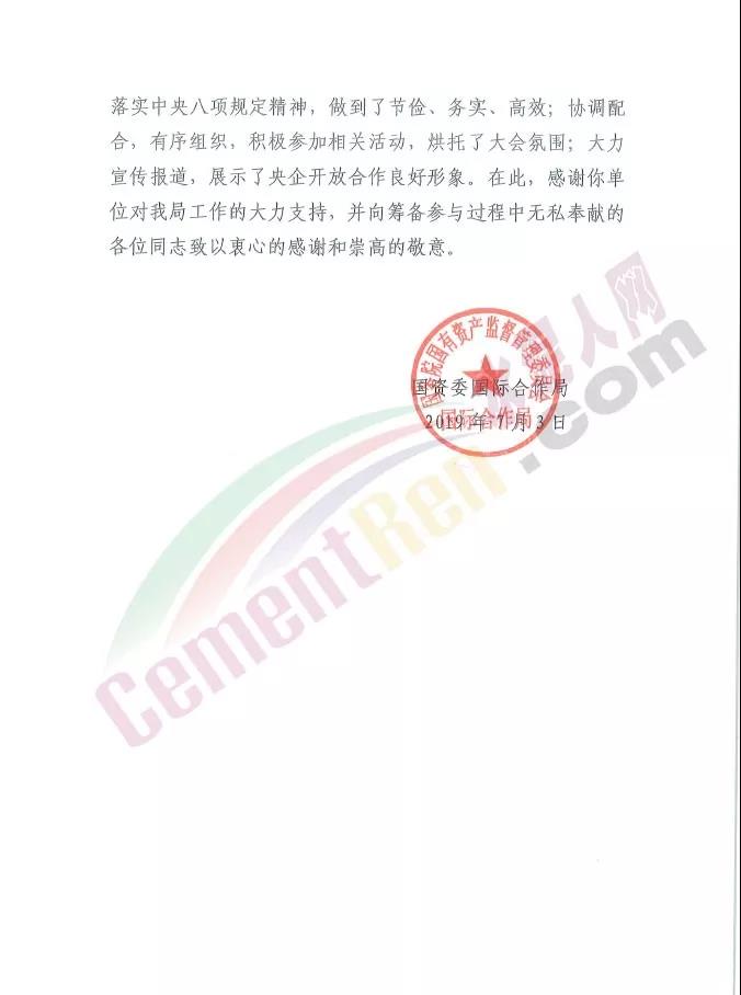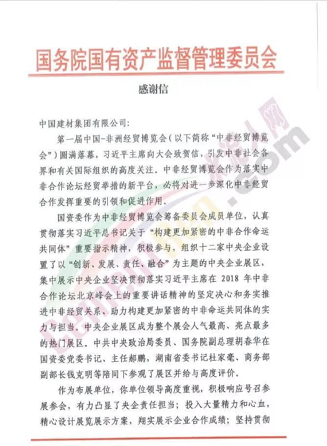 日前,國務(wù)院國有資產(chǎn)監(jiān)督管理委員會發(fā)感謝信給中國建材集團(tuán)有限公司稱:作為中非經(jīng)貿(mào)博覽會布展單位 ,中國建材集團(tuán)領(lǐng)導(dǎo)高度重視,積極響應(yīng)號召參展參會,有力凸顯了央企責(zé)任擔(dān)當(dāng);投入大量精力和心血精心設(shè)計展覽展示方寧,翔實展示企業(yè)合作成績;堅持貫徹落實中央八項規(guī)定精神,做到了節(jié)儉、務(wù)實、高效;協(xié)調(diào)配合,有序組織 ,積極參加相關(guān)活動,烘托了大會氛圍;大力宣傳報道,展示了央企開放合作良好形象。感謝信原文如下: