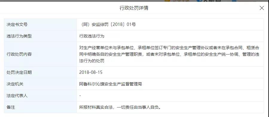 2018年 8月15日,阿魯科爾沁旗安全生產(chǎn)監(jiān)督管理局對(duì)企業(yè)行政違法行為實(shí)施行政處罰,處罰內(nèi)容為對(duì)生產(chǎn)經(jīng)營單位未與承包單位 、承租單位 簽訂專門的安全生產(chǎn)管理協(xié)議或未在承包合同、租賃合同中明確各自的安全生產(chǎn)管理職責(zé),或者未對(duì)承包單位 、承租單位 的安全生產(chǎn)統(tǒng)一協(xié)調(diào)、違法行為的處罰。