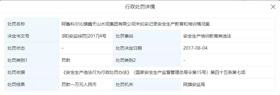 2017年8月4日,阿旗安監(jiān)局曾針對(duì)企業(yè)未如實(shí)記錄安全生產(chǎn)教育和培訓(xùn)情況做出行政罰,罰款一萬元人民幣。