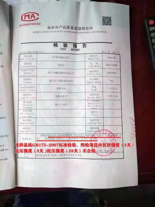 記者在亳州市產(chǎn)品質(zhì)量監(jiān)督檢驗(yàn)所6月出具的檢驗(yàn)報(bào)告上看到,該水泥樣品顯示: