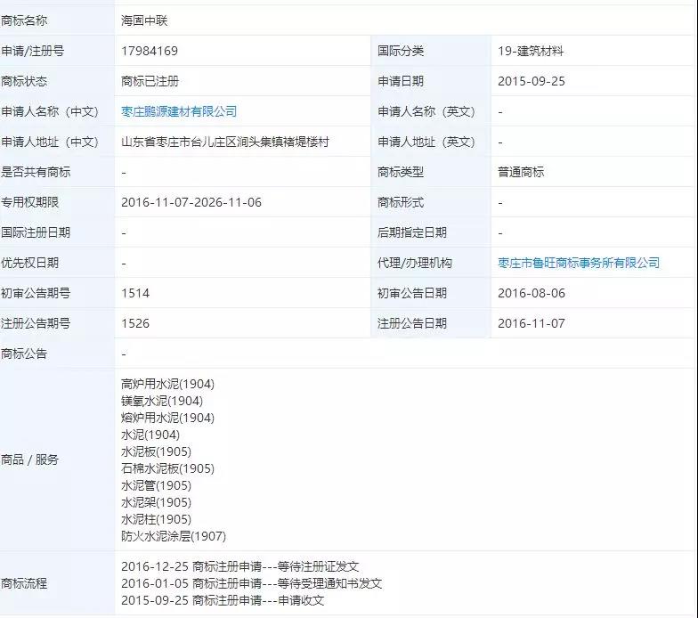 棗莊鵬源建材有限公司海固中聯(lián)注冊(cè)商標(biāo)
