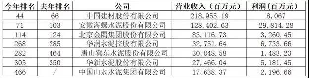 查看榜單得知,與去年排名相比,七家水泥企業(yè)今年的排名都有所上升。排名上升最快的是唐山冀東水泥,較去年排名上升了182位。值得一提的是,去年未入榜的中國山水水泥今年成功進入榜單,排名第466位。