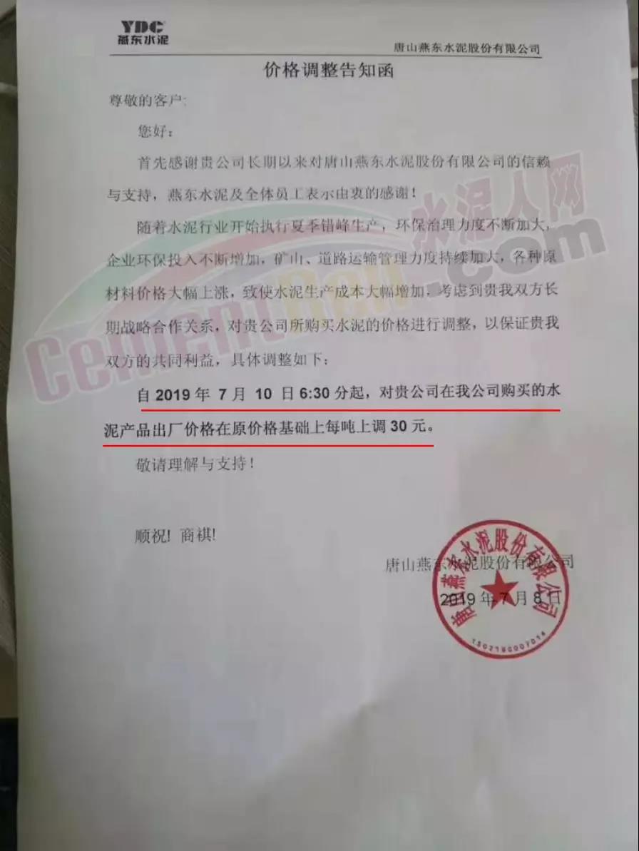 唐山燕東水泥發(fā)布《價格調(diào)整告知函》稱:隨著水泥行業(yè)開始執(zhí)行夏季錯峰生產(chǎn),環(huán)保治理力度不斷加大,企業(yè)環(huán)保投入不斷增加,礦山道路運(yùn)輸管理力度持續(xù)加大,各種原材料價格大幅上漲,致使水泥生產(chǎn)成本大幅增加,因此對產(chǎn)品價格做出調(diào)整。具體調(diào)整為,自2019年7月10日06:30起,水泥產(chǎn)品出廠價格在原價格基礎(chǔ)上,每噸上調(diào)30元。
